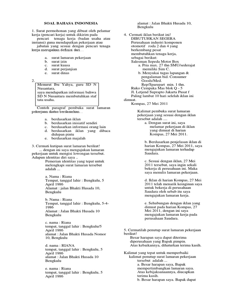 Soal Bahasa Indonesia Kunci Jawabannya from imgv2-2-f.scribdassets.com Maybe you would like to learn more about one of these? Tuliskan paragraf pembuka surat lamaran pekerjanan berdasarkan iklan !. Check spelling or type a new query. We did not find results for: